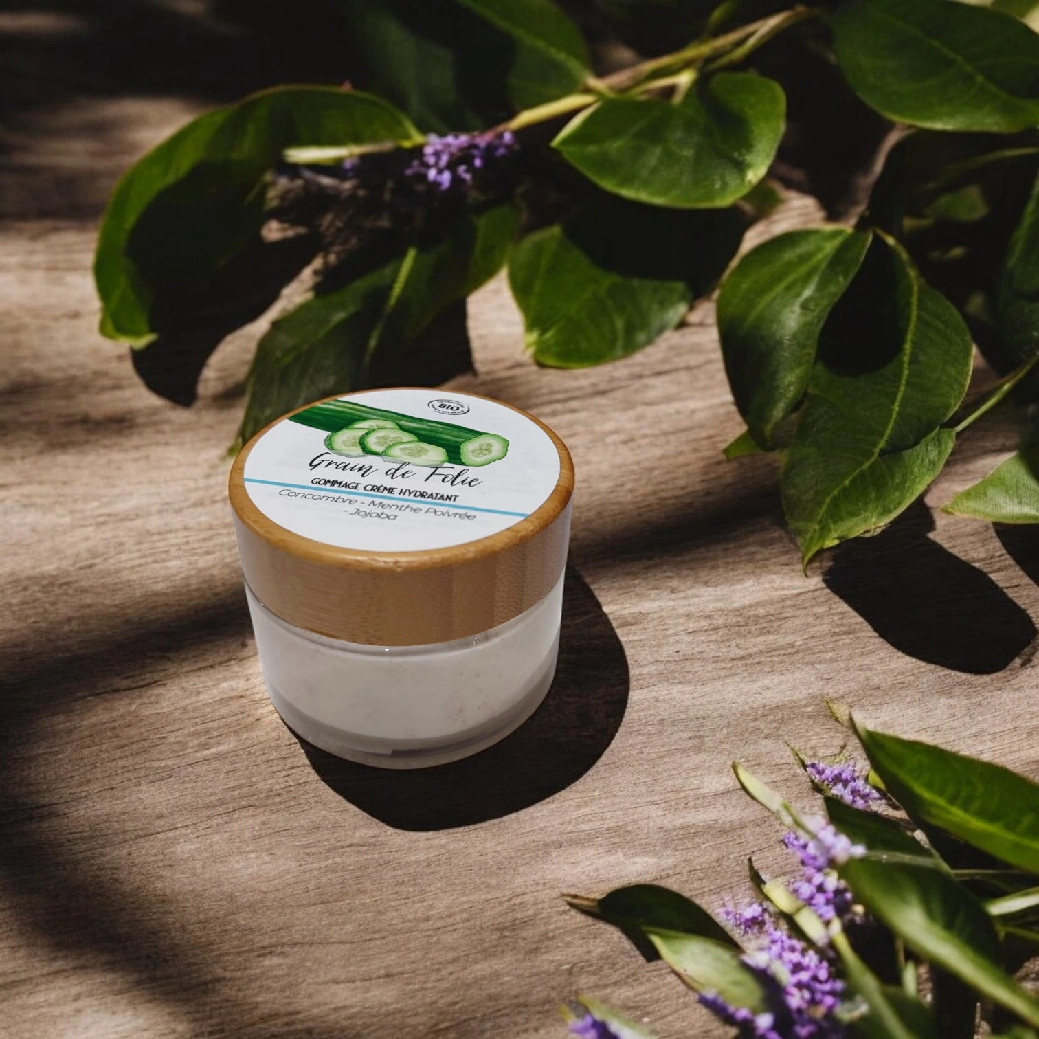 1. Appliquez une petite quantité de **Gommage Exfoliant et Hydratant « Grain de Folie »** sur une peau propre et humide.